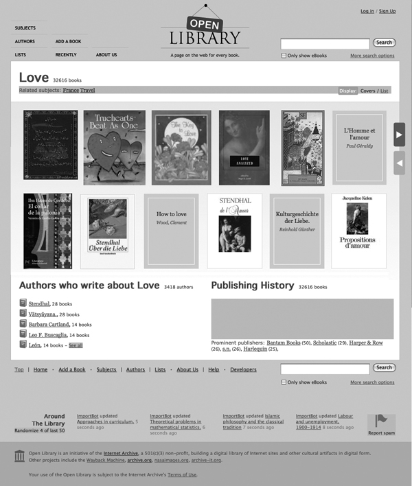 It is possible that a library catalog could mimic this user view by presenting subjects as entities in the catalog, rather than as added entries on a bibliographic record. This approach is being experimented with on the Open Library, where subjects are treated as “first class” objects with their own Web pages (see figure 13).