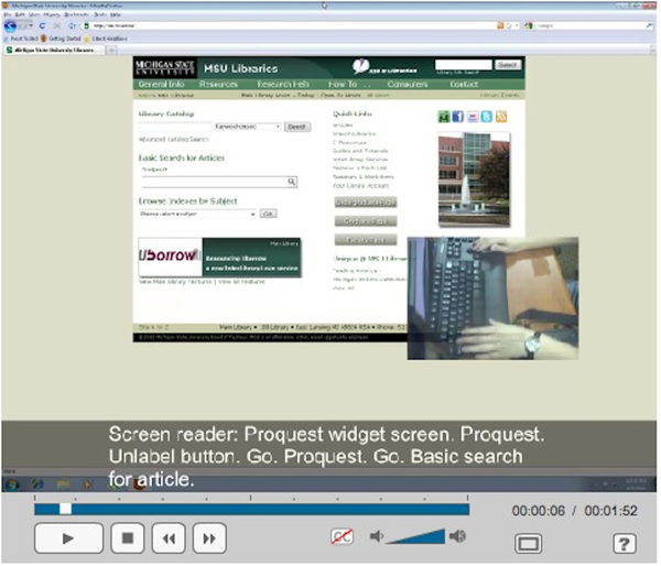 It is important to understand firsthand how users with print disabilities interact with Web content. S. G. Ranti Junus, the author of the previous chapter, conducted a large-scale accessibility assessment of e-resources at the Michigan State University Libraries. She has provided two captioned, split-screen video examples of a blind user encountering e-resources features on the MSU Libraries website using a screen reader (see URLs in the gray box; figure 4.2 is a still from Video 1). You can watch these brief videos to gain perspective on how screen readers work, as well as the frustrations improper semantic structure and other accessibility issues can create for users with disabilities.