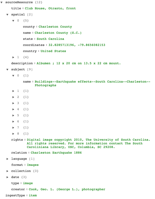 Figures 3.16 and 3.17 show the outcome of the data processing that occurs during resource ingest. In these figures, data from the source record on object geospatial location, which is represented in the coverage property in the original record, is mapped to the DPLA spatial property and enhanced with county, state, geocoordinate, and country data. Likewise, subjects that were returned as a text block in the original record have been parsed into discrete entries within the subject property. Additional linked data processing is possible for this record, including the resolution of corporate, publisher, and personal name authorities as well as subject heading authorities in external linked data endpoints.