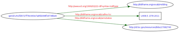 BIBFRAME Annotations include only three properties (annotates, annotationAssertedBy, annotationBody) and provide a container for the inclusion of annotations either by value or by reference. Annotation types currently documented in BIBFRAME include CoverArt, Holdings, and Reviews, but can be expanded to include a much wider range of information. Each annotation type has its own properties. For example, the Holdings Annotation includes the callno, callno-ddc, callno-lcc, and callno-udc properties. Figure 3.9 shows a simple call number Holding entity.