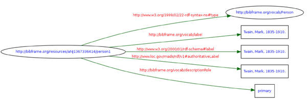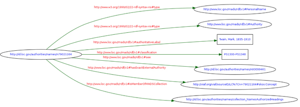 It is worth noting that these entities are quite different from the full MADS record for these authorities and that the converted BIBFRAME record does not reconcile authority data with the endpoints available at Library of Congress Linked Data Service. The MADS record there for Mark Twain includes 369 triples that capture the descriptive, versioning, and administrative metadata associated with this record. MADS records also include links to the Virtual International Authority File (VIAF), which, in addition to representing the author’s authority data, includes aggregated information about related works, coauthors, and publication dates. A small subset of the MADS record for Mark Twain, excluding variant name forms and administrative metadata, is shown in figure 3.8. This figure and a view of the MADSRDF file help show exactly how much data can be accessed when URIs are used to link bibliographic records to the Library of Congress Linked Data endpoint.