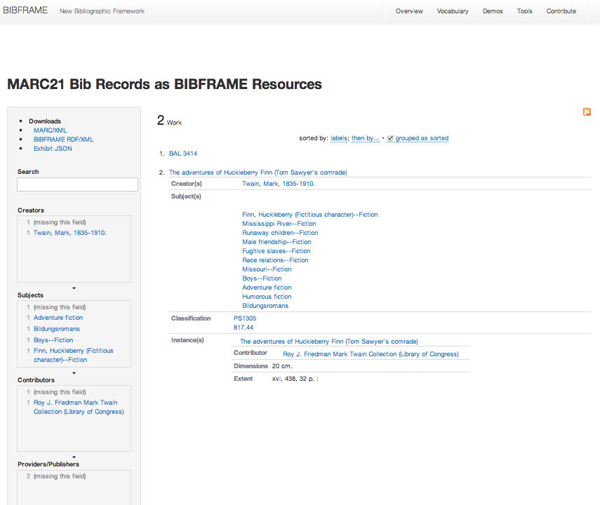 These tools produce output in a web-based user interface (figure 3.10). This interface provides a faceted navigation scheme as well as multiple serialization formats (MARC/XML, BIBFRAME RDF/XML, and Exhibit JSON). It also provides an easy-to-implement method for libraries to explore the BIBFRAME model and test their own data conversion. This tool was used to extract all of the metadata in online appendixes 1–3 as well as in figures 3.2–3.10.