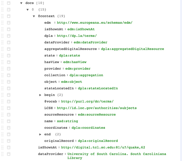 The @context information returned as part of each document (figure 3.15) maps the terms used in the internal DPLA and EDM properties, including utilized vocabularies and schemas, object types, and collection types to IRIs for those terms. By providing IRI mapping to external schemas, the @context object contextualizes data in JSON-LD and enables computational analysis in support of semantic services.
