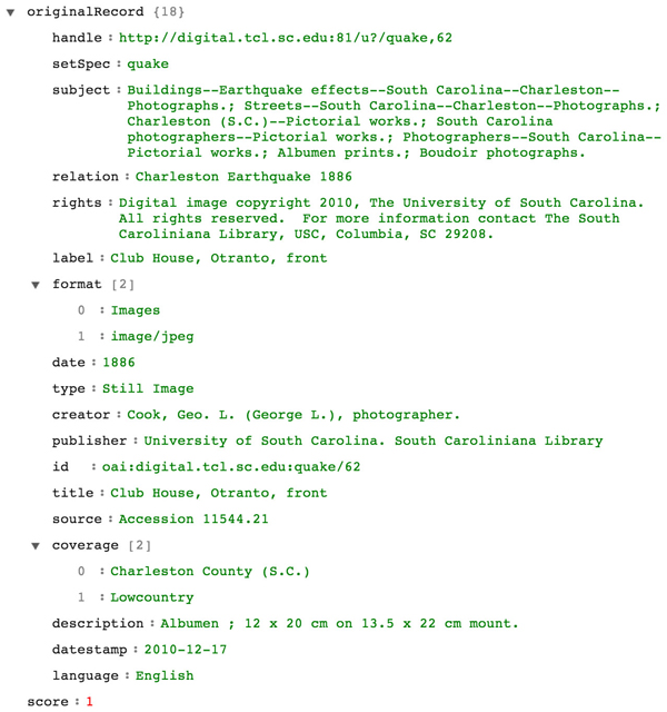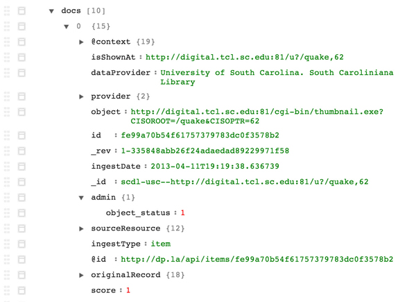 The docs stanza of the JSON-LD document includes source, administrative, and descriptive metadata on the object returned. Figure 3.14 shows a subset of information from a single document in the results set. This includes a context section that provides information about the object within the DPLA environment, a provider section that includes the source of the object, an admin section that documents the status of the object, a sourceResource section that contains detailed metadata harvested from the source repository parsed into DPLA fields, and an originalRecord section that contains metadata as it was structured when harvested.