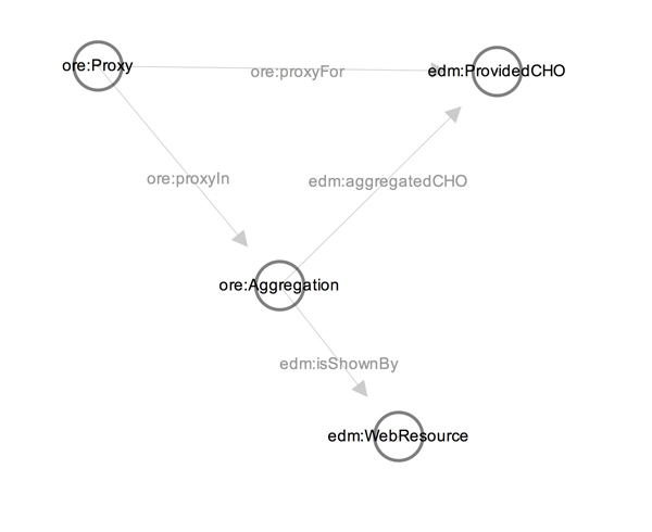 The EDM makes considerable use of the aggregation, aggregated resource, and proxy properties of the OAI-ORE environment. The EDM uses a locally defined property to track contributed cultural heritage objects, often referred to with the acronym CHO (edm:ProvidedCHO) and its associated web representation (edm:WebResource). In order to connect these classes, the EDM also depends on an ore:Aggregation class that defines the relationships between these resources. This focus on providing a means for tracking both the cultural heritage object itself and the descriptive metadata surrounding it reflects a firm adherence to the one-to-one principle that has been a challenge in metadata record-based digital library systems.