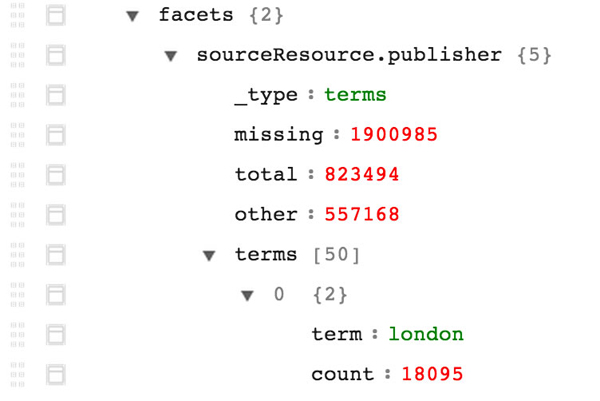 Figure 3.12 shows the broad count of resources available with the API call (2,064,314), the actual resources returned (resource 0–9), the actual documents (docs), and information about the facets requested. Figure 3.13 shows the facet information returned in the JSON-LD document. This figure shows the JSON-LD data element @type (terms) and the top fifty facets along with their document counts. The faceting information can be used to generate new API requests that focus just on specific facet information. For example, a request to get all documents that had as a facet value “ala” for the field sourceresource.Publisher would be http://api.dp.la/v2/items?sourceResource.publisher=ala&api_key=.