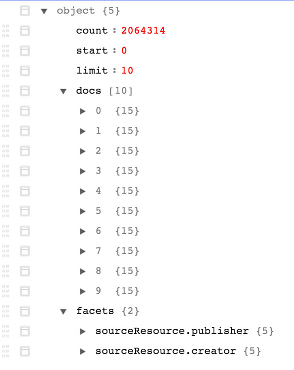 The DPLA internal data model is based on RDF but also employs an RDF-inspired serialization called JSON-LD that is disseminated via API output. The data model of the API includes broad information about the request object, an array-based list of documents or collections, and an array-based list of facets. While the internal structure of the DPLA employs RDF, the data-harvesting method employs the OAI-ORE standard. As with the BIBFRAME and Europeana data models, an emphasis is placed on supporting the creation of graph structures. More information about the data model is available on the DPLA site, although at the time of this writing, the documentation is not yet complete.