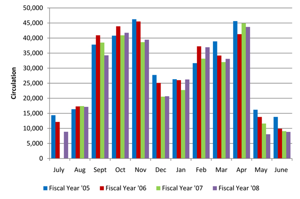 The NGC solution is designed to make the library's physical collections more easily discoverable. A good metric to show the NGC's impact is to analyze the usage of the library's physical collections. We can do this by analyzing the circulation statistics (see figures 15 and 16).