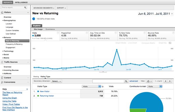 Figure 17 is an example of a heat map created with Crazy Egg, a product that records the location of each user's cursor on the screen when the user clicks. This information is used to produce a heat map image that can be overlaid on the webpage to illustrate what parts of the website are the most frequently used. Red color shows spots that are most frequently used. Cooler colors, like greens and blues, show spots that are less frequently used. Crazy Egg and other similar tools use a bit of JavaScript added to a webpage that allows the software to work. This approach is similar to that of other usage analysis tools, such as the popular Google Analytics (figure 18).