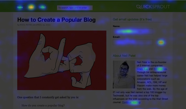 A heat map image created by CrazyEgg that overlays the web page to illustrate user click locations. |