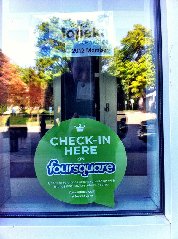I recently saw a statistic that said 5 percent of people in the United States use Foursquare.3 It might be more or less in your service area. But think about it this way: if you see a Foursquare sticker (see figure 6.1) in your community, then you should seriously consider setting up a Foursquare place and becoming the manager of that place for your library. This lets people check in to your library using Foursquare.