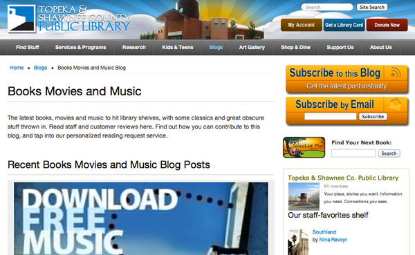 We have also reworked our blog topics and the number of blogs that we offer. Before this redesign, we created blogs on topics we thought might be of interest to our customers. For this redesign, most blogs are tied directly to part of our physical collection. Much of our library’s collection is separated into what we call neighborhoods. For example, we have a travel neighborhood. All the travel-related books are placed together physically. This makes that part of our collection much easier to browse. When we group a collection, circulation statistics for that collection go up 15 to 20 percent.