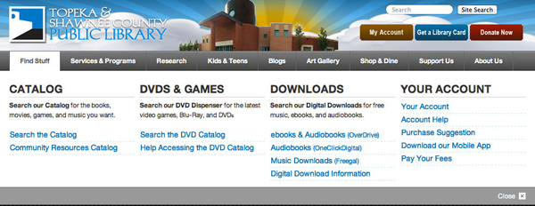 The My Account button was the first website tweak we made after going live with the redesign. In the original design, here’s what we had planned: to get to the My Account page, users would click Find Stuff in the drop-down menu, then choose Your Account on the right-hand side of the menu (see figure 2.4). That’s still there. We were confident that would work, and we knew that many library catalog users would access My Account from the catalog, thus bypassing our website navigation entirely. Since we were providing two ways to find My Account, we thought that was adequate.
