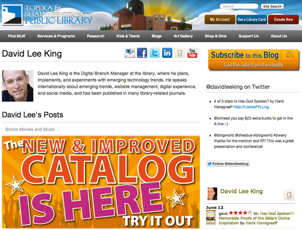 We have also experimented with Google Plus. At the moment, this page is mainly a placeholder. Not too many people in Topeka, Kansas, are using Google Plus at the moment. The ones that do also heavily use Twitter. This, of course, might change, so our library Google Plus space is reserved, just in case.