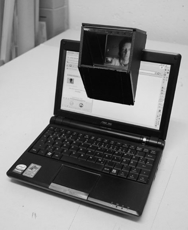 Video calling also operates in an uncanny valley, one in which digital communication is almost lifelike enough but only if social presence is sufficient to sustain an acceptance of Web video's flaws. In the average video call, not only do you frequently deal with low resolution and error, your own image is open in a distracting mirrorlike smaller window, and camera positioning makes it impossible to make eye contact with the other party or parties. To bridge this gap a few people have rigged DIY mirror systems to achieve eye contact (figure 27), but these are still infrequently used.13 Until screen-embedded cameras and faster network speeds are the norm, video callers will operate in this uncanny valley and accept a semidisturbing degradation of interpersonal communication quality only to satisfy a compelling urge to see someone.