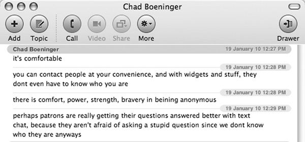 Michael Buckland has argued that the discourse of digital reference has too often focused on “empowering” librarians than fulfilling information needs; in a sense, the kiosk project was a perfect manifestation of this tendency.7 It was an attempt to raise librarian visibility as a means of enhancing services, but it did not reflect user preference in the digital environment. In our kiosk discussions, Chad makes an excellent point about why text-based communication is easier for library users to handle (figure 26): it is faster and requires less social protocol, which facilitates streamlined, low-threshhold information exchange. Text-based communication in its contemporary forms–chat, email, IM, and SMS–is proving to be the most efficient digital reference format. Putting a literal face on virtual reference may have been a laudable attempt to deepen the digital interaction, but it did not consider that users might simply prefer the simplicity and anonymity of text.