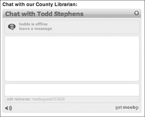 Meebo's help page describes Meebo Me as “a small chat window that you can put on your webpage for visitors to talk with you…. Your buddy list at meebo.com will light up when someone visits your page and then you can double click on their name to strike up a conversation. In one click, no registration or download required, visitors can start typing in the chat window on your page to talk with you.”15 See the Darien Library Contact Us page for a great example of a Meebo Me widget embedded in a library Web site.