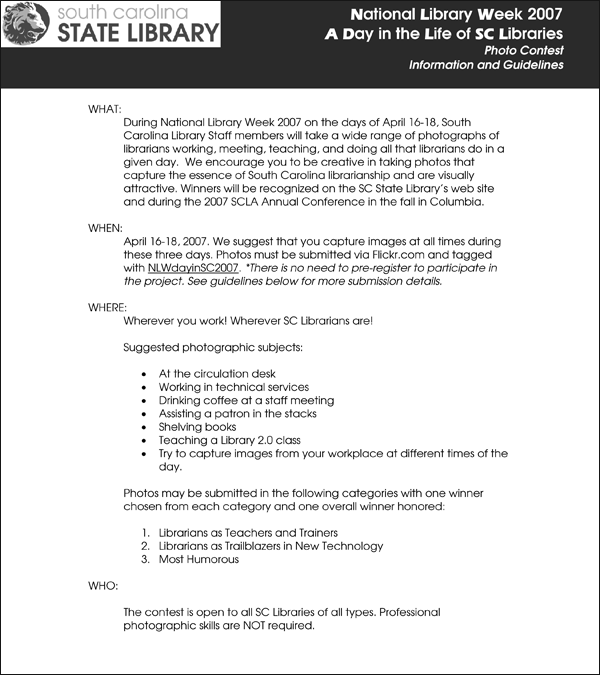 Thankfully, the kerfuffle died down, and more libraries are using Flickr to share images of their programs, services, and people than ever before. One notable use is the South Carolina State Library's “Day in the Life of SC Libraries” project (see figure 8). Created by Dr. Curtis Rogers at the South Carolina State Library, the contest yields some humorous and touching results. Visit the Flickr site to see the various entries. Rogers was pleased with the results: “All total, I probably spent about 7.5 hours on this and what a great return on the investment of time. It really got people fired up and excited about promoting library services and programs, and excited about using Flickr!”25