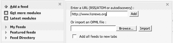 - Add all of your library blogs and other RSS feeds. Note that the page also includes a Web search module for access to Google, Yahoo! and more.