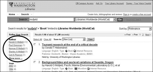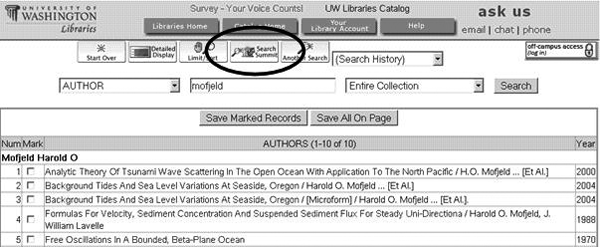 UW online catalog showing holdings for Harold Mofjeld and search summit button. Accessed May 2008. |