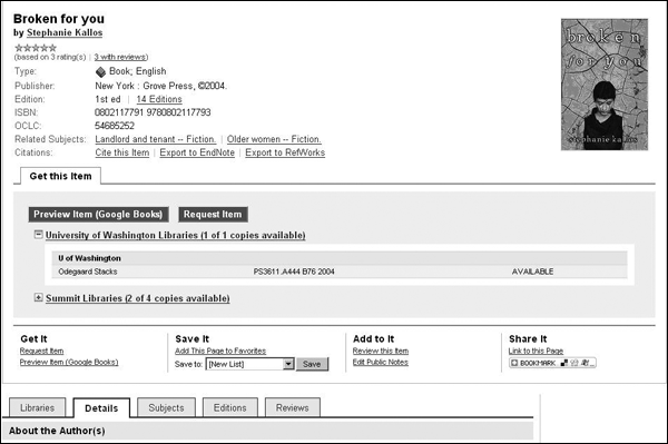 The upper block displays basic bibliographic data: author, title, publisher, standard numbers, and so forth. Records include hot links for authors and subject headings. Detailed records in WorldCat Local can display book jackets and include reviews. Users can obtain citation formatting and export records to EndNote or RefWorks. There are also many ways for users to create links to records in social networking tools such as MySpace and del.icio.us.