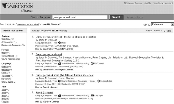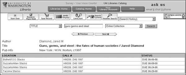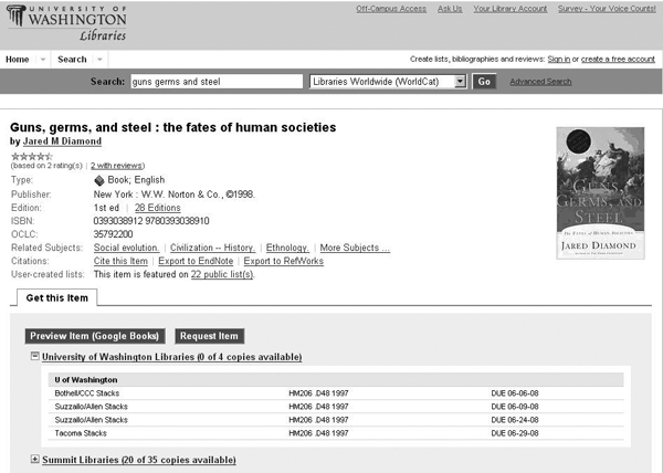 Results of a search in the University of Washington local catalog. All copies of Guns, Germs and Steel are checked out. Accessed May 2008. |