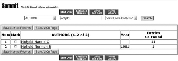 Summit catalog showing search results for the author “mofjeld.” Accessed May 2008. |