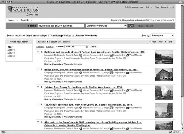 Realizing that libraries have vast amounts of digital content in repositories other than their catalog, OCLC can harvest records from OAI repositories, crosswalk them to MARC format, and load them directly into WorldCat, where they become part of a user's search and discovery experience. This is how OCLC handles CONTENTdm and other digital collections. In addition to providing information about the individual items, WorldCat Local also displays harvested thumbnail images in the brief results list (see figure 1).