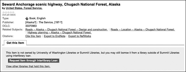 When a user searches for materials that are not owned by the University of Washington or by another Summit library, the user is presented with the option of requesting materials through interlibrary loan (figure 11). The request would be opened in the user's ILL (ILLiad) account, and OpenURL would fill in the citation information.