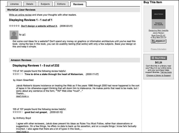 User-contributed and Amazon.com reviews for Designing Web Usability on the UC Davis Libraries' implementation of WorldCat Local. Accessed May 2008. |