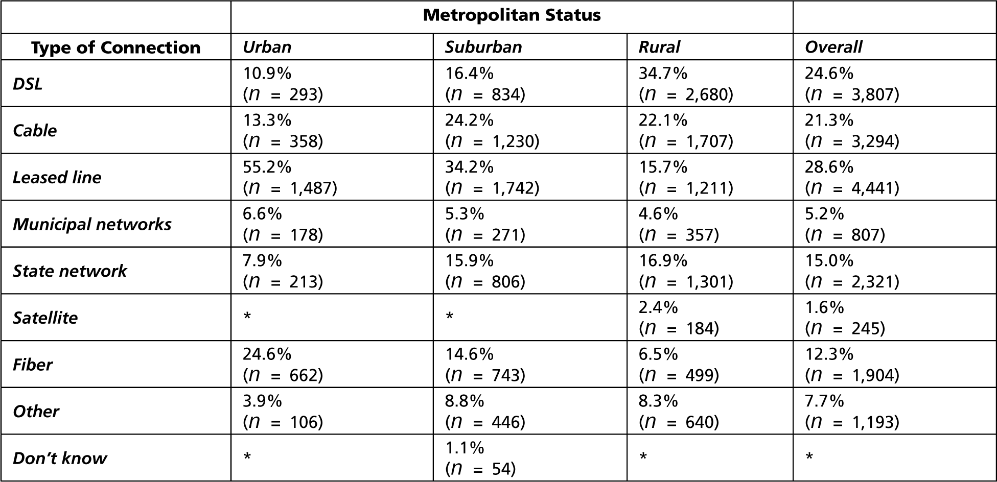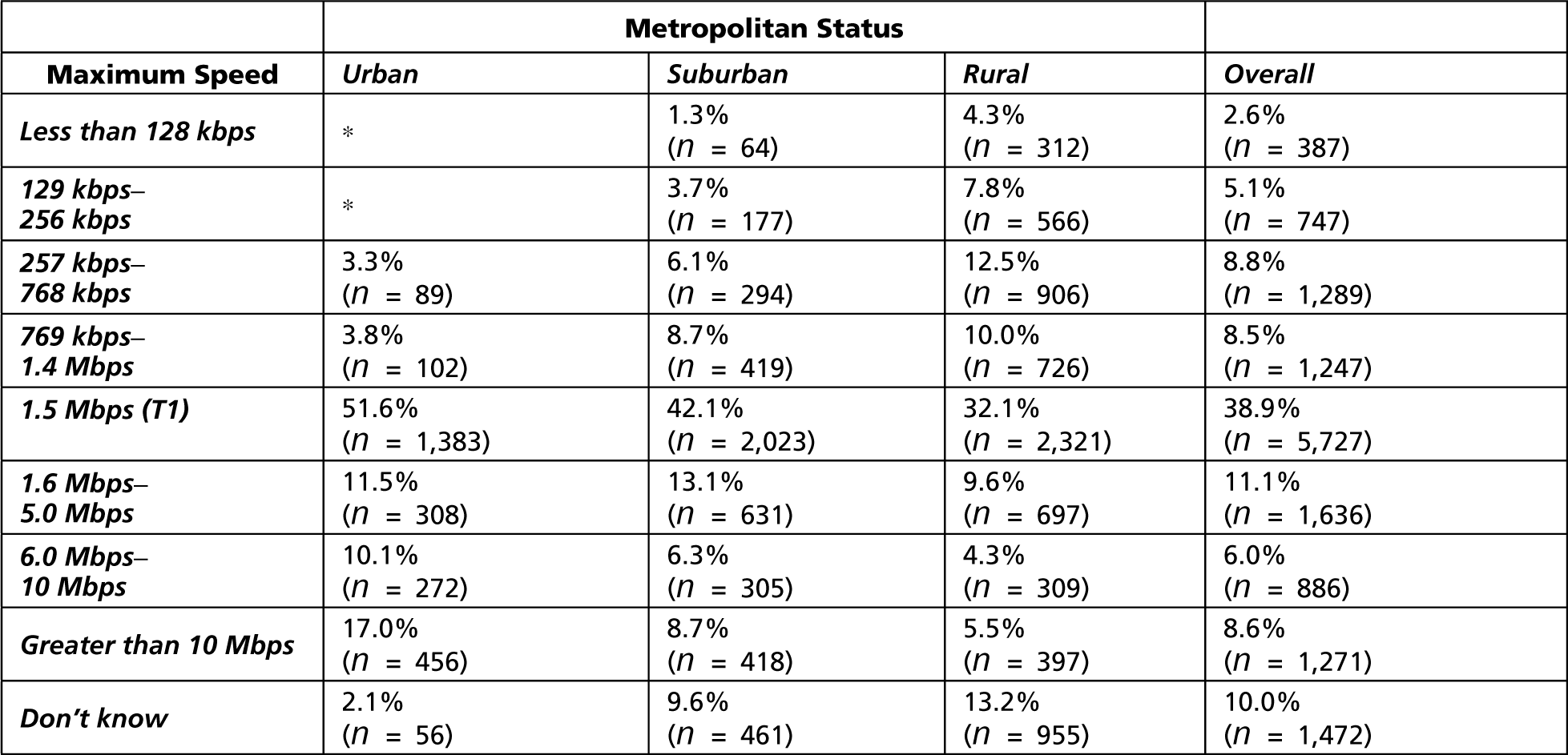 One positive development is that the number of libraries reporting connection speeds of 769 kbps or faster increased 11 percent since last year. More than half of urban libraries (51.6 percent), 42.1 percent of suburban, and 32.1 percent of rural libraries now report offering a T1 connection. In the COSLA questionnaire, several state librarians suggested T1 should be the minimum level of connectivity for all libraries in their states. Although many libraries improved access by moving to T1 from lower speeds, there was a slight decline (about 3 percent) in the number of libraries reporting access speeds above 1.5 Mbps.
