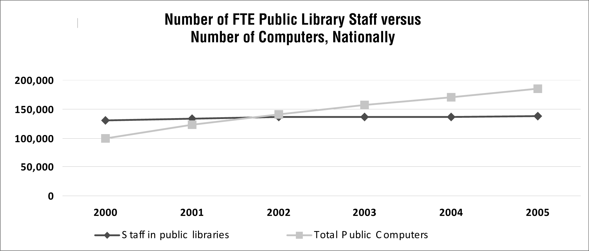 Like additional cars on the interstate, additional computers and Internet services in libraries contribute to the “traffic” and create additional demands for staff to orient patrons and mediate public access to these resources. Along with an 86 percent increase in the number of computers in U.S. public libraries, there was an 18.6 percent increase in library visits, from 1.15 billion in 2000 to 1.36 billion in 2005. The number of full-time equivalent (FTE) staff grew only 6 percent over the same time period (figure 6).9