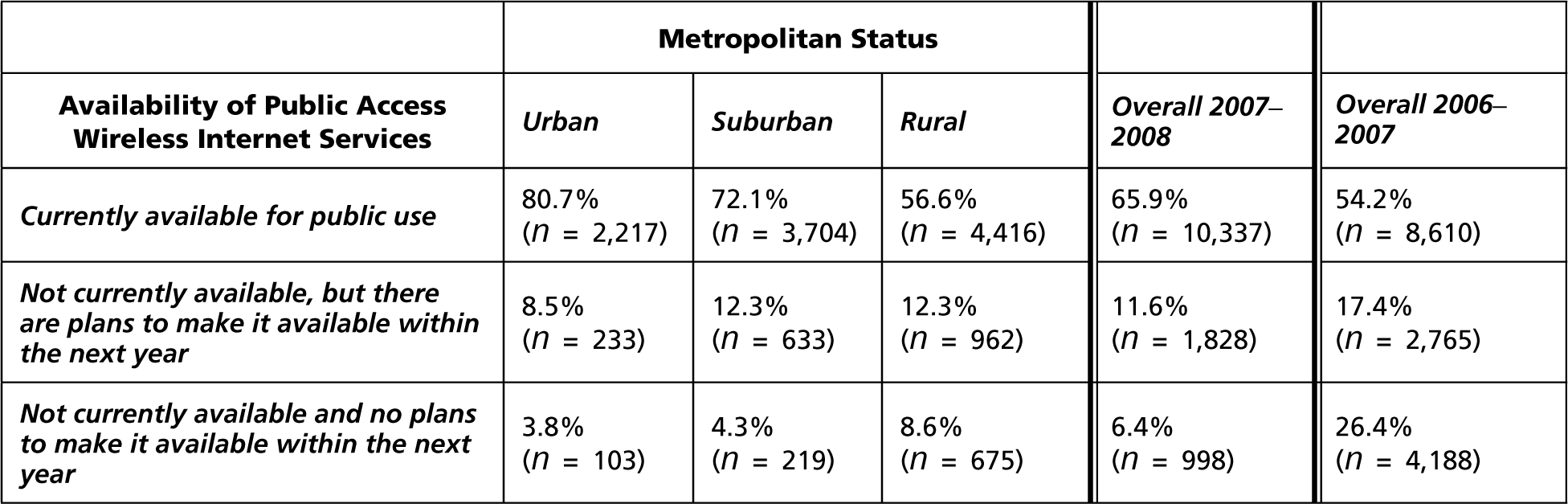 Public access wireless Internet connectivity in public library outlets, by metropolitan status. |