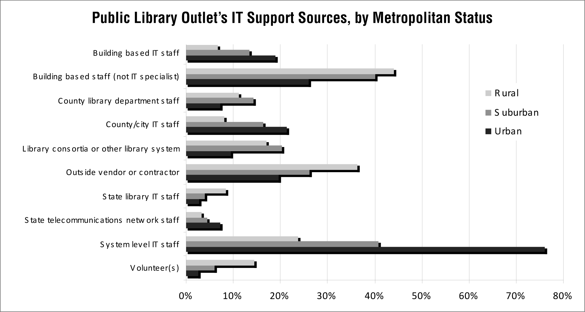 The disparities are once again pronounced between urban and rural libraries, however (figure 9). Rural libraries are far more likely than urban libraries to depend on librarians or other library staff who are not trained in IT (44.1 percent) and on outside vendors (36.3 percent)—or even volunteers (14.4 percent)—to support their technology. Urban libraries are most likely to have system-level IT staff (76 percent).