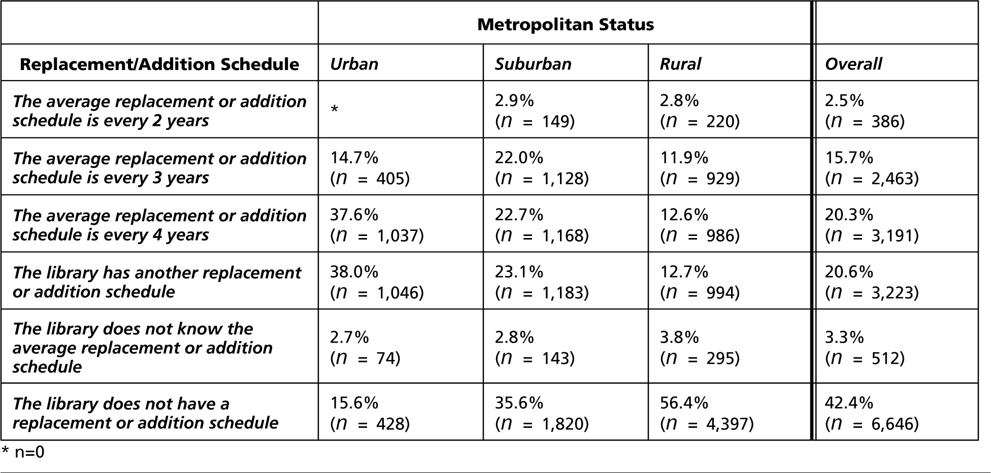 Wireless access has increased in public libraries as well. Figure 2 presents the current findings by metropolitan status and overall for the current and previous year study. Libraries were also asked about workstation/laptop replacement or addition schedules. The number of libraries reporting no specific plan for replacement was surprising (figure 3). Rural libraries were less likely to have a formal replacement strategy, as also were suburban libraries. The most common replacement/addition cycle was three to four years.
