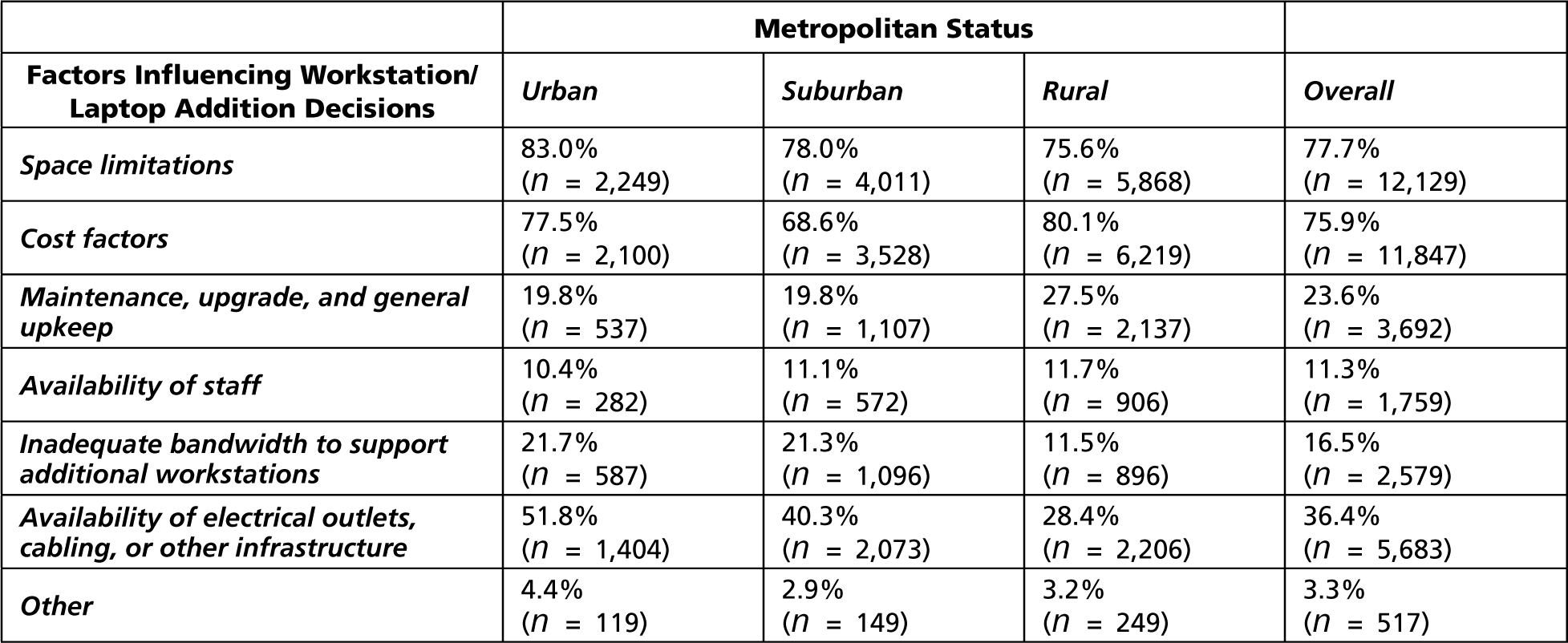 Factors influencing addition of public access Internet workstations/laptops, by metropolitan status. |