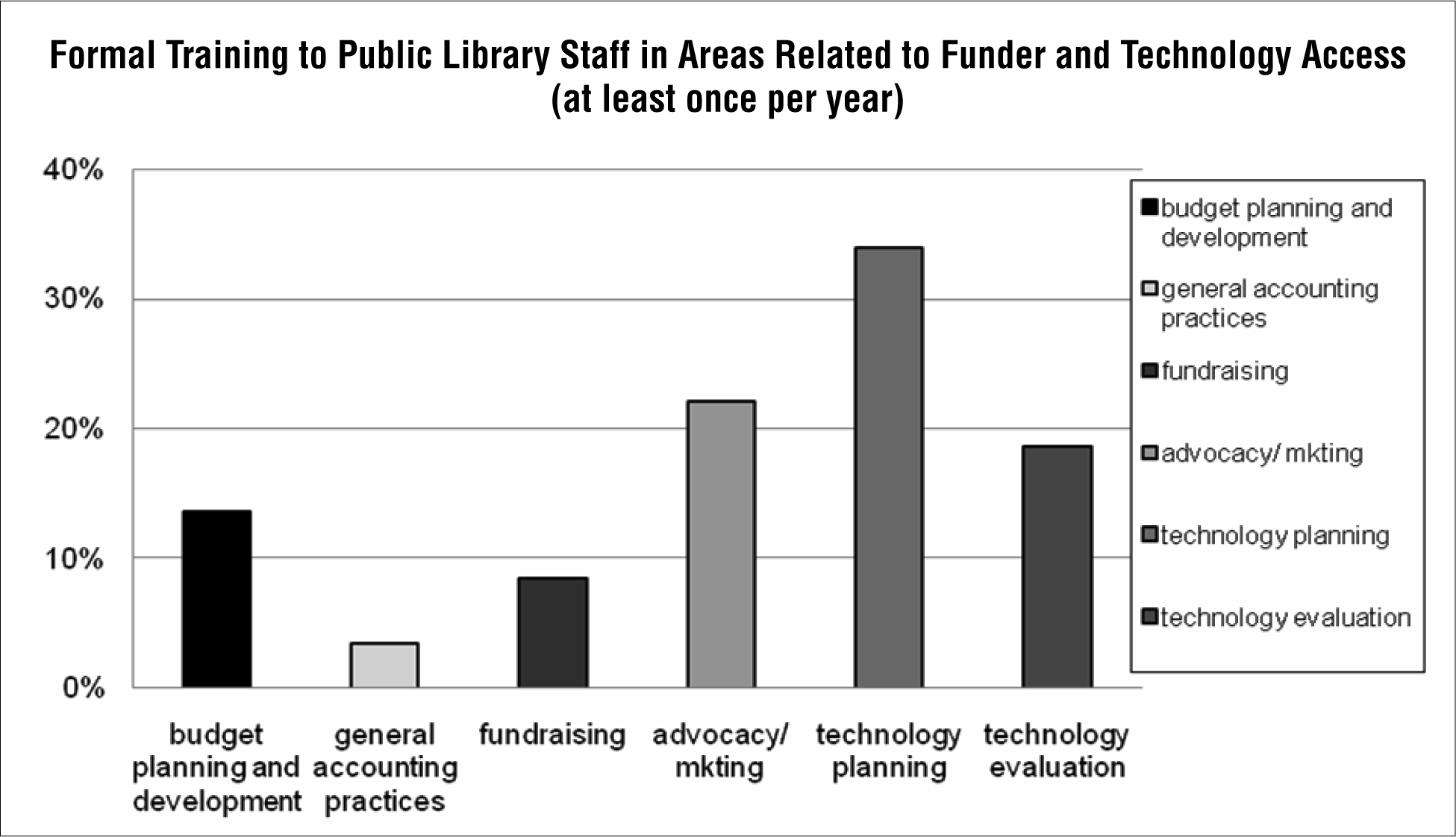 In the questionnaire to COSLA, about 90 percent reported offering some formal training to public library staff in six categories that build skills in funding, public awareness, and/or management of technology in libraries (figure 8). Technology planning (34 percent) was most likely to be offered at least once a year, followed by advocacy/marketing (22 percent) and technology evaluation (19 percent).