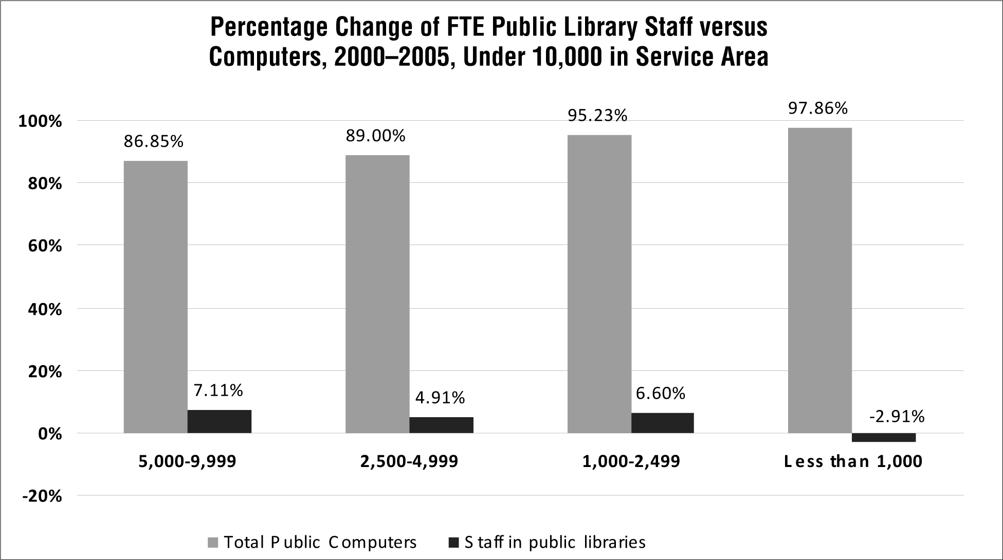 When examined by population service size, the impact on the smallest public libraries (serving fewer than 10,000 residents) is even stronger. Libraries serving fewer than 1,000 residents saw the greatest percentage increase in the number of public computers (up 98 percent), along with a decline in the number of FTE staff (–3 percent; see figure 7).