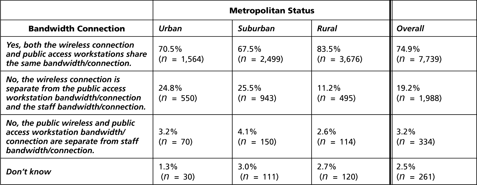 Public library outlet shared wireless-workstation bandwidth, by metropolitan status. |