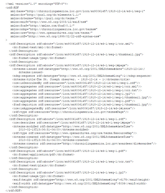 RDF/XML was selected to demonstrate Resource Map serialization in this issue of Library Technology Reports because it was implemented in our example of the NDNP; however, this should not imply any endorsement of RDF/XML or give the impression that it is better or more widely adopted than other serializations. In fact, the ORE specification suggests that Atom may currently be the most widely used serialization.3 In addition to RDF/XML, the ORE specification documents two other formats, RDFa and Atom XML, although others may be used.