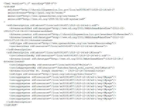 More detailed recommendations and syntax can be found in the “ORE User Guide: Resource Map Implementation in RDF/XML.” To demonstrate some of the more common elements, we will iterate the triples and then serialize the RDF Graphs from chapter 2 for page and issue Aggregations from the National Digital Newspaper Program's implementation, which uses RDF/XML. It may be helpful to flip back to the graphs and reference them with the Resource Maps as we construct them.