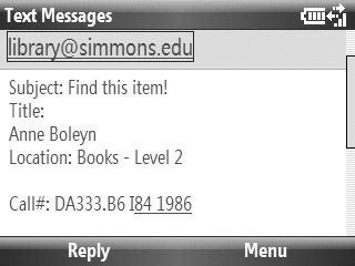 The Undergraduate Library at the University of Illinois at Urbana-Champaign is offering students the opportunity to be notified by text messaging when librarian research specialists are offering office hours and are available to provide in-depth reference assistance. Australia's Monash University Library offers SMS notifications to inform students when their items are due back, remind them about overdue items, and advise them of fines incurred. Library patrons at the Simmons College Library can send themselves text messages from the library catalog with item records attached (see figure 27). The Orange County Library System in Orlando, Florida, provides an opt-in SMS text messaging service that sends reminders to patrons when their items are coming due and when classes that they have registered for are nearing. And the Library at the BI Norwegian School of Management in Oslo, Norway, is offering SMS alerts to notify students when items they have requested become available.