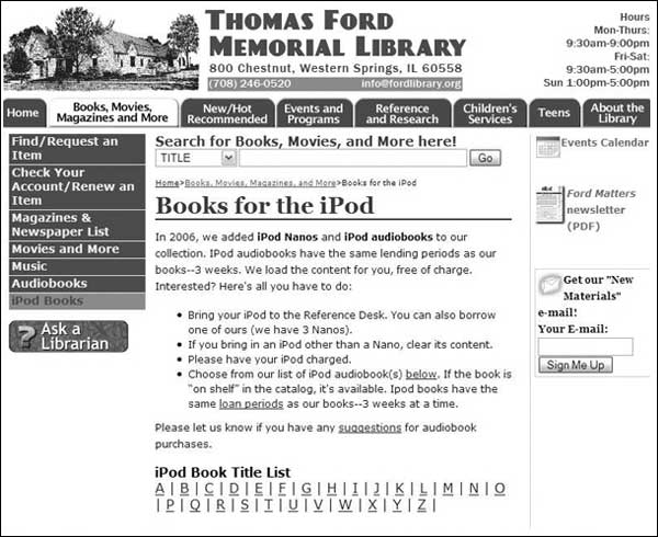 The Thomas Ford Memorial Library (see figure 24) and the St. Joseph County Public Library are both offering audiobooks ranging from The Devil Wears Prada to Animal Farm preloaded on lendable iPod Nanos for patrons to take with them. Librarians will also load audio titles onto patrons' own iPod devices for the duration of the three-week loan period. The Crouch Fine Arts Library at Baylor University has transferred all listening assignments for the semester's music courses onto iPods, which are organized by professor and course number. Students can check out these preloaded iPods for up to 12 hours. The University of Virginia Library has created a collection of over 2,100 e-books from its Etext Center, which includes American history titles, American and British fiction, major authors, and Shakespearean works. It has had more than 8.5 million downloads from its Web site over 21 months.1