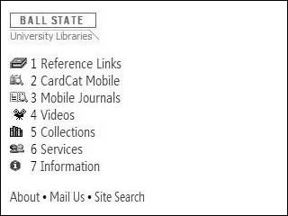 Ball State University Libraries has established a mobile Web presence that offers library patrons a catalog search, journal search, videos about the libraries, information about library collections and services such as ILL and course reserves, and quick links to mobile reference Web sites pertaining to weather, news, search, sports, and finance (see figure 23). The University of Richmond Libraries' mobile site enables visitors to search through the Voyager catalog, access live laptop and PC availability information, and submit e-mail, SMS, or IM reference questions. Ohio library-goers can search the OPLIN Mobile Web site to find the closest public library of the state's 250 branch locations. On the University of Virginia Libraries' mobile Web site, library news and events are displayed as clickable links along with exhibitions information, directions, library hours, and a text-only version of the desktop Web site. The Medical Library at Boston University has made all of its subject guides viewable in mobile format and created search functionality for e-book titles, e-journal collections, bibliographic databases, and the library Web site as a whole. NYU's The Arch mobile portal offers a search of the university's electronic resources collection by title, subject, or format as well as information about the library.
