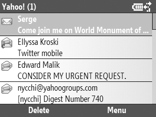 Push e-mail is available on most of today's smartphones, PDAs, and iPhones. Users may configure several types of mail accounts on their device: POP3 or IMAP for personal e-mail, such as Yahoo! (see figure 8) or AOL Mail accounts; Microsoft Exchange Server or Good Mobile Messaging for accessing corporate e-mail; and Research In Motion's BlackBerry e-mail. If your phone does not have this type of functionality built in, you can install it yourself by downloading an application, such as emoze or the open-source Funambol, that will enable you to push e-mail as well as sync your contacts and calendars.