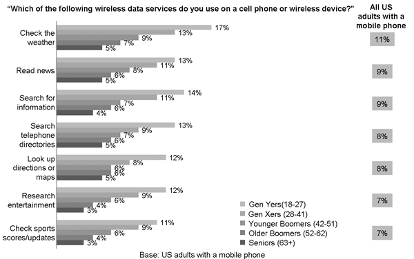 Percentage of cell phone owners who use their phones check weather reports, read news, and look up various types of information. Source: Forrester's North American Technographics® Benchmark Survey, 2007. |