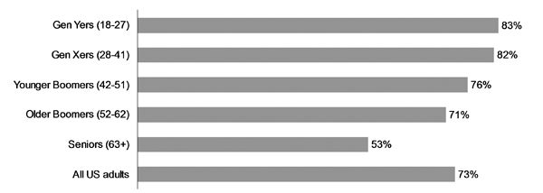 Percentages of cell phone owners among U.S. adults. Source: Forrester's North American Technographics® Benchmark Survey, 2007 (Charles S. Golvin, “Which Generations Are Doing Mobile Data Activities, 2007,” Forrester Research, Jan. 4, 2008). |
