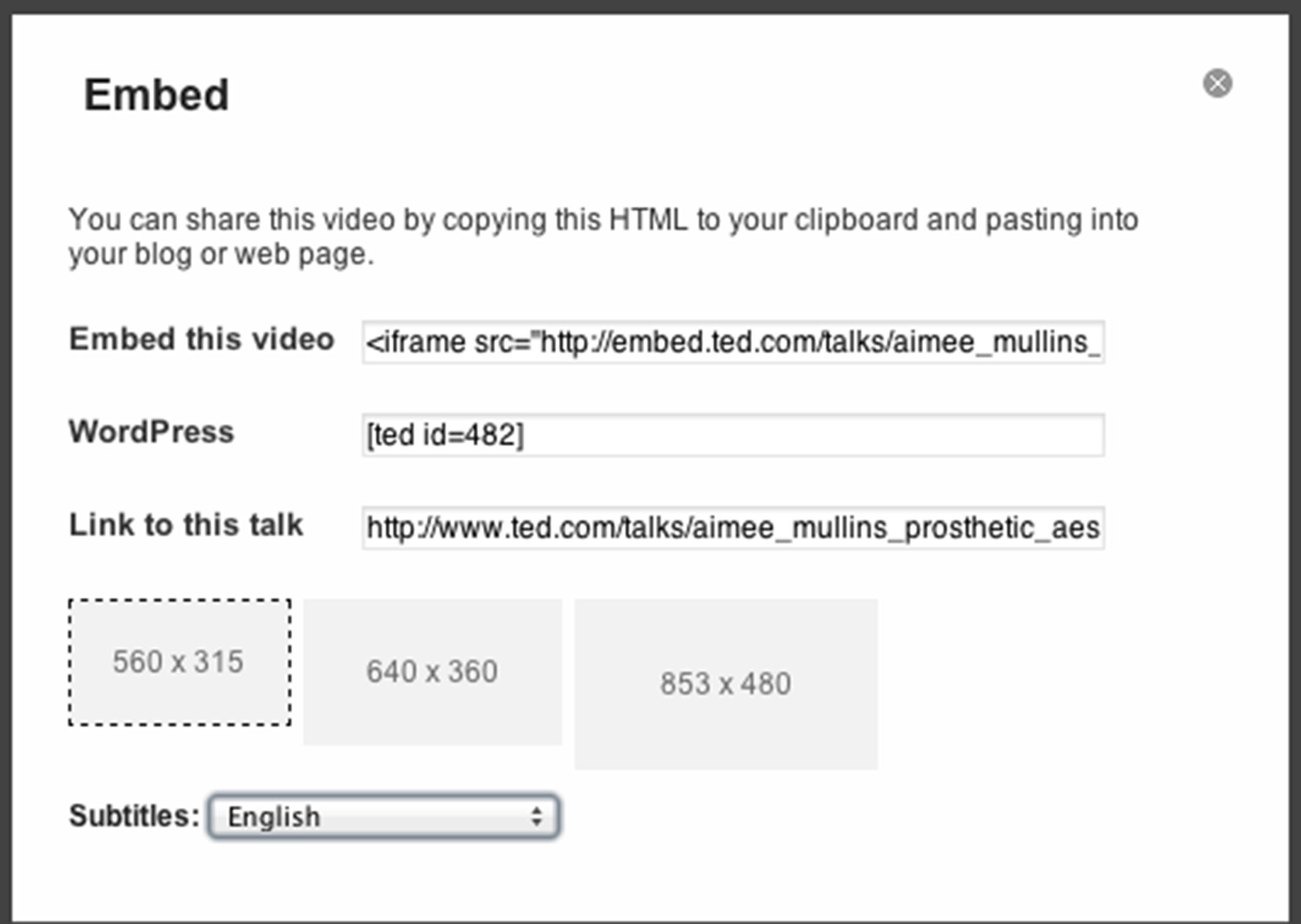 TED Talks videos are available for download, and a TED app is available for iOS devices (iPad, iPhone, iPod Touch). TED is available through podcasts through the iTunes store and for Android mobile devices through Google Play. Sizes and quality can be modified for viewing and embedding optimization. A quick list is available for download information. There is a specific option for embedding in a WordPress site, as well as permalinks available for all videos. Subtitles are available and optional for embedding (see figure 2.2).