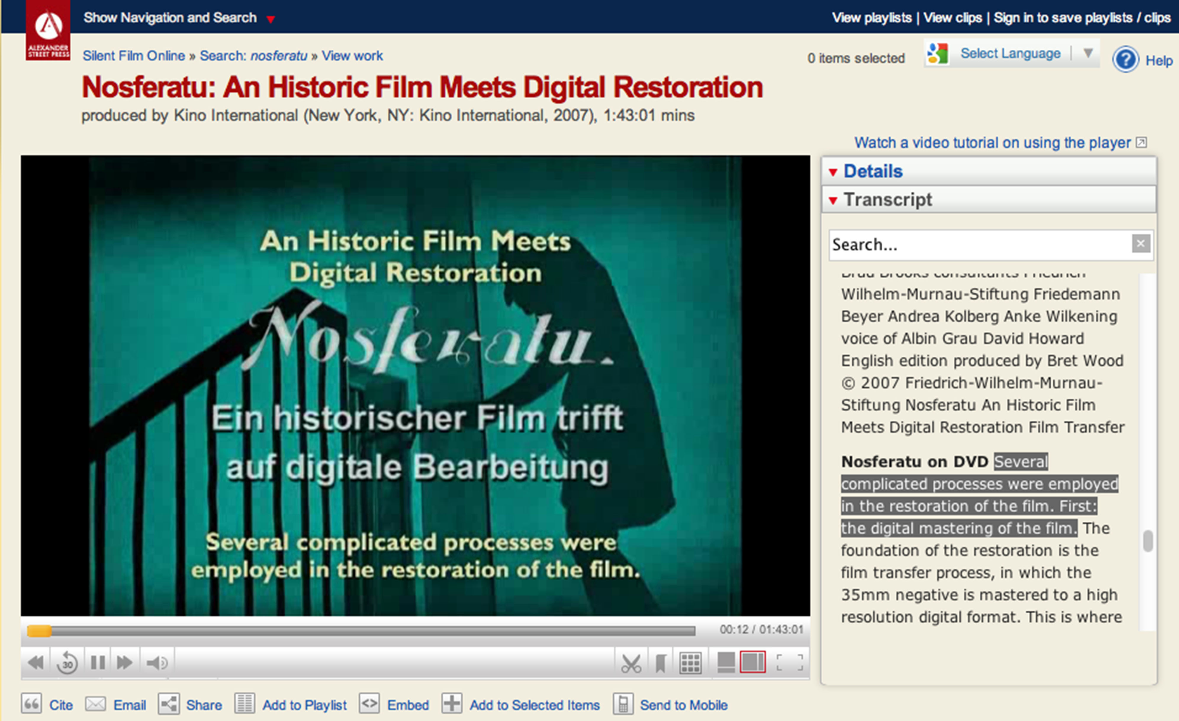 Example of transcript and tools options from Alexander Street Press’s Silent Film Online |