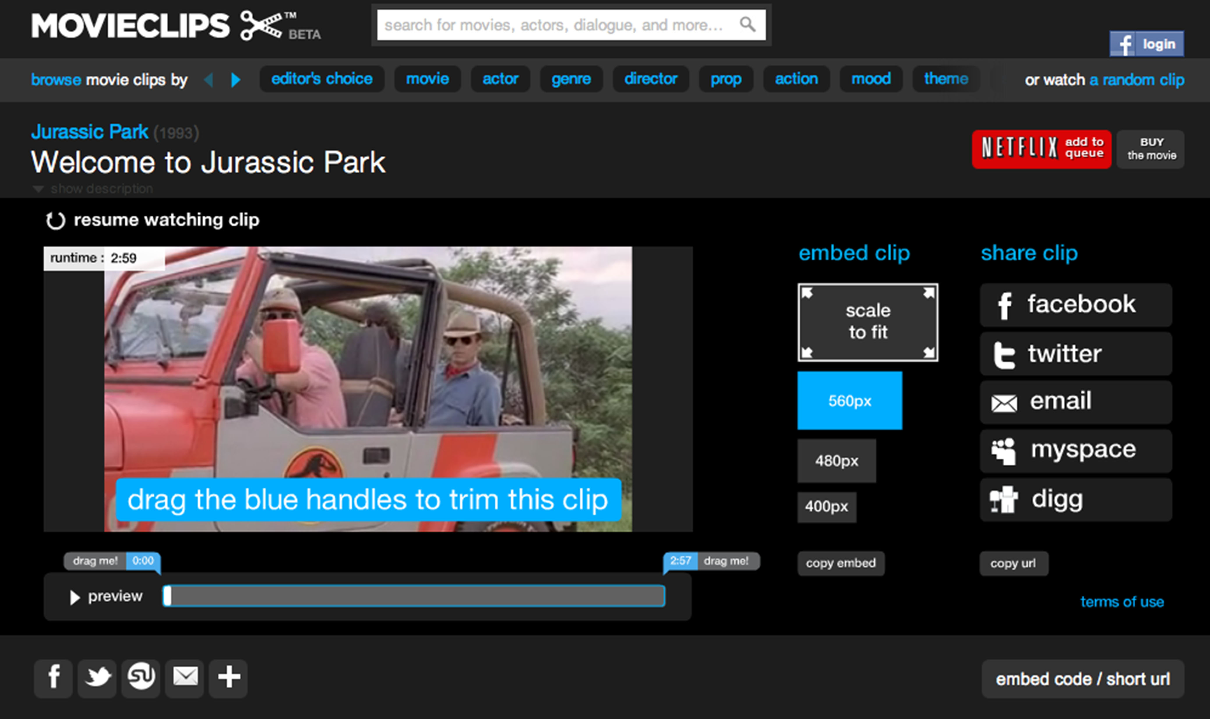 Example of MovieClips options for trimming, embedding, and sharing of clips (http://movieclips.com/cda5-jurassic-park-movie-welcome-to-jurassic-park) |